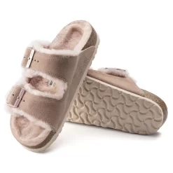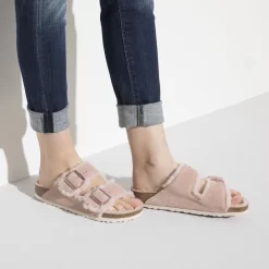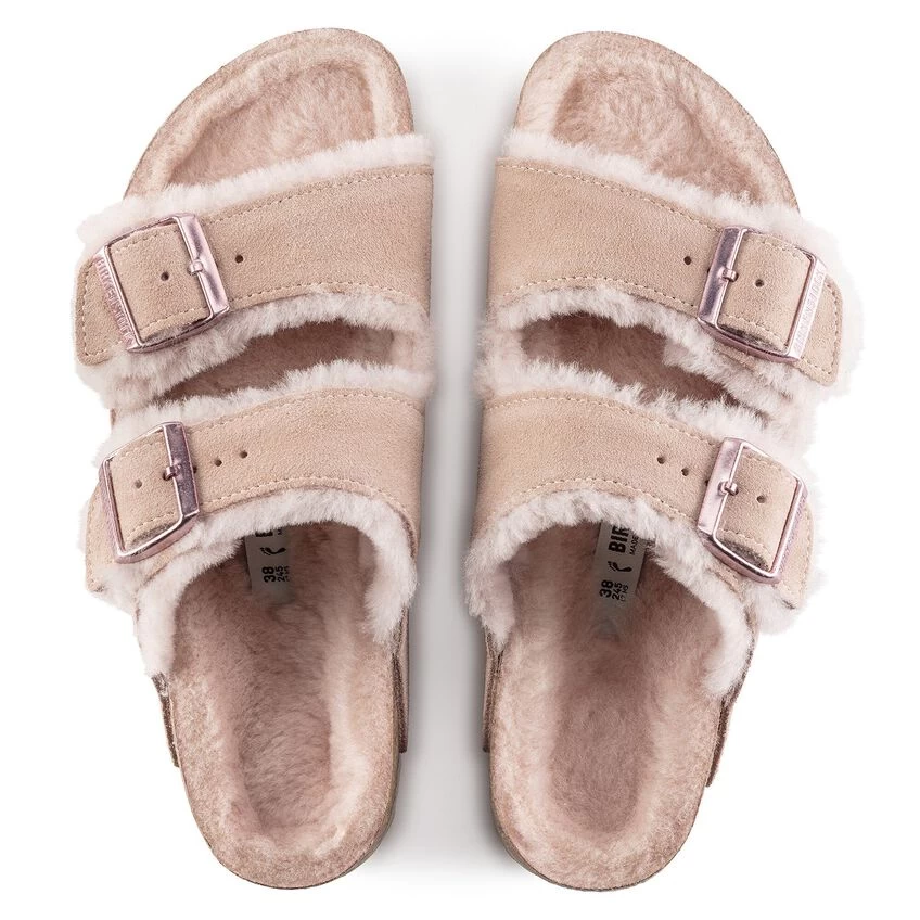 The legendary two-strap design from BIRKENSTOCK – the Arizona. Iconic style with the signature comfort of the BIRKENSTOCK footbed. Featured in genuine high-quality suede – and is now available in an extra cozy version thanks to a soft, genuine shearling lining on the anatomically formed cork-latex footbed and straps. These sandals are perfect for chilly, winter evenings.