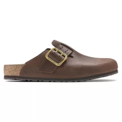 The signature slip-on clog from BIRKENSTOCK – the Boston. A casual-wear staple that is perfect all year round with a simple, adjustable design and contoured cork footbed that forms to the shape of your foot. This modern version of our iconic Boston clog features a double prong brass tonal buckle and a high traction rubber outsole. The cushioning midsole made from EVA promotes stability and comfort. Made of premium leather with edge embossing