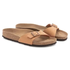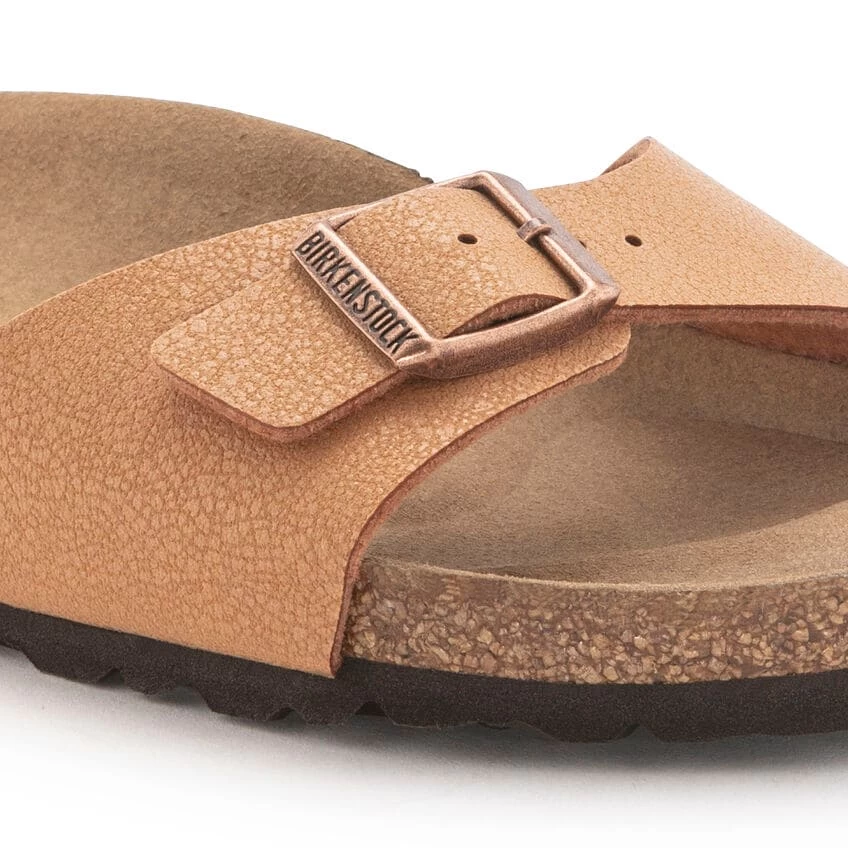A strap, a buckle and a contoured cork footbed are masterfully combined to create the original Birkenstock sandal – the Madrid. An iconic slide with a classic buckle accent now available in a vegan material. The upper is made from the skin-friendly, hard-wearing synthetic material Birkibuc.
